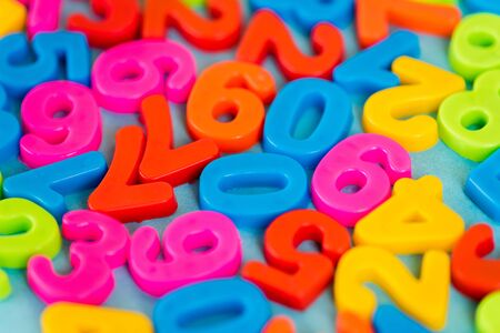 Selective focus of colorful plastic numbers on blue surface