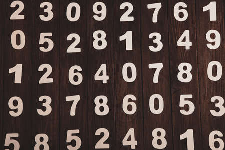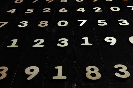 Numbers on black wooden background. Numbers are scattered in the dark.