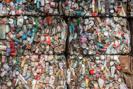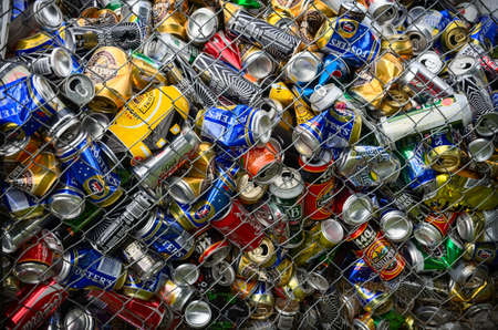 Chiang Rai, Thailand : 31-December-2018 : Stack of aluminium can before waste processing at recycling plant.