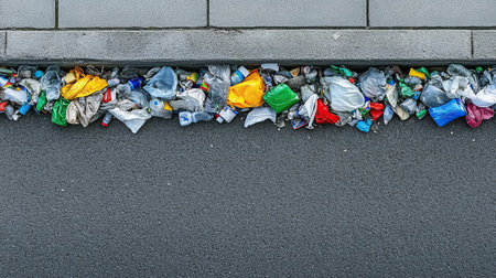 A striking urban cityscape image reveals the extensive accumulation of plastic waste on the streets, emphasizing environmental concerns and the impact of urban pollution.