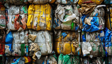 Plastic waste packed in bales and bags awaits processing in a warehouse, highlighting the challenge of recycling