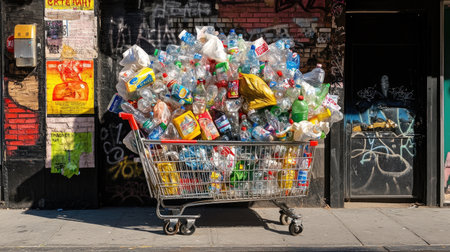 A shopping cart overflowing with plastic bottles and containers reflects urban waste challenges. The vibrant street art backdrop adds complexity to the environmental theme.