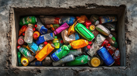 Recycling bin filled with assorted plastic bottles and containers promoting environmental responsibility AI