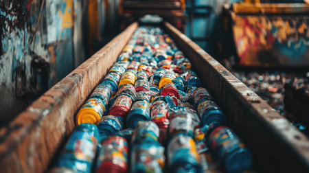 A vibrant scene of colorful plastic bottles flowing down a conveyor belt in an abandoned factory, highlighting urban decay and the surreal beauty in industrial environments.