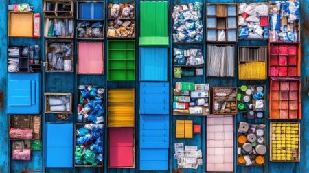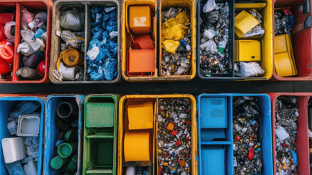 Aerial view of colorful recycling bins filled with various types of waste, highlighting the importance of recycling for environmental sustainability and waste management initiatives.