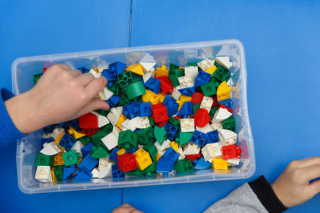 Khabarovsk, Russia, February 18, 2022. Male kids sorting multicolored Lego details into boxes