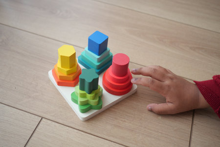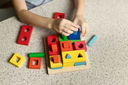 close-up of a toddler's hands playing with colorful wooden blocks on a tray, learning shapes and colors in natural light
