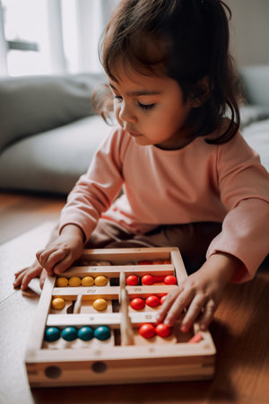 Young child, Latino girl, playing quietly with wooden toys, surrounded by a peaceful atmosphere. AI generative illustration of Montessori study materials