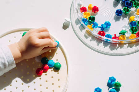 A child plays with a colored educational wooden toy at home.Close-up.Top view.