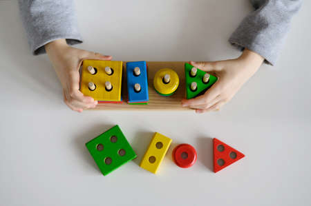 Close-up of hands of unrecognizable child inserting wooden blocks into the grooves of the educational toy. concept of children education.