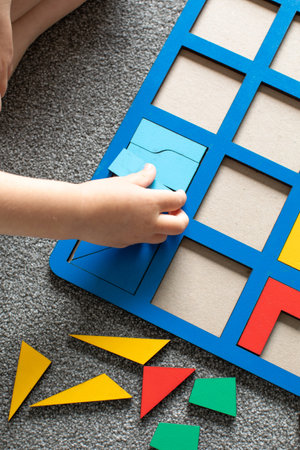 Montessori material. Boy study at a home school. Son in rainbow clothes. Concept of using the resources of mathematical geometry for teaching children.