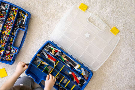 Khabarovsk, Russia, February 18, 2022. Boy sorting Lego colored pieces into boxes with small cells