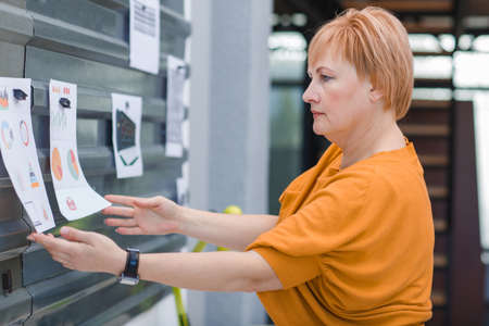 An office worker a woman examines working schedules on the wall.