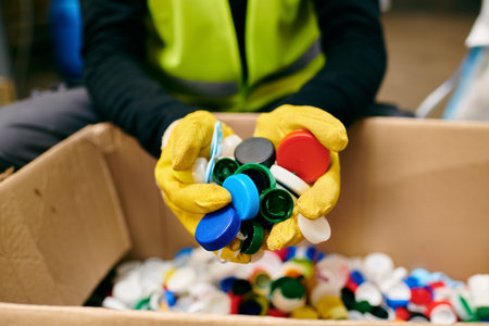 closeup shot of a person wearing gloves while sorting through garbage, created with generative ai