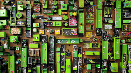 This vibrant aerial view showcases a creative workspace featuring an array of green desks and various art supplies, capturing an organized yet dynamic environment filled with inspiration.
