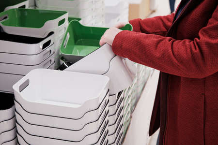 Woman in a store buys a container for storing things and products. The concept of buying containers for neat storage of things. Hands close up shot