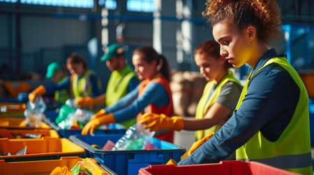 Workers efficiently sort recyclables in a bustling industrial facility promoting sustainability.