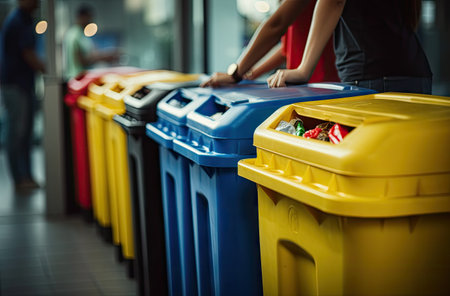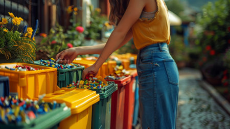 Plastic waste sorted into colorful recycling bins promotes responsible waste management and environmental sustainability