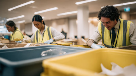 Medium shot of professionals conducting waste audits in office bins to identify recycling efficiency and sustainability gaps