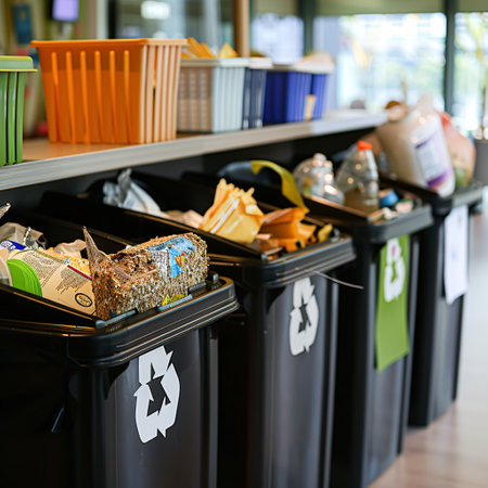 An image depicting overflowing recycling bins in an industrial facility highlights waste management challenges.