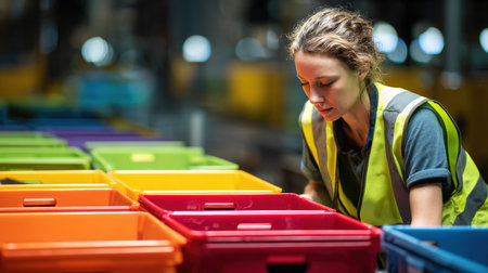 A female logistics employee organizes items into color-coded shipping bins in a bright warehouse. The scene captures the photorealistic detail of the sorting process.