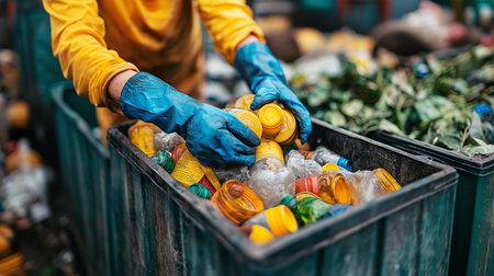 Individual sorting recyclables into eco friendly bins against dark backdrop for waste awareness