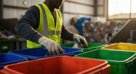 Worker sorting recyclable materials into colorful bins inside recycling facility wearing safety vest and gloves for waste management.