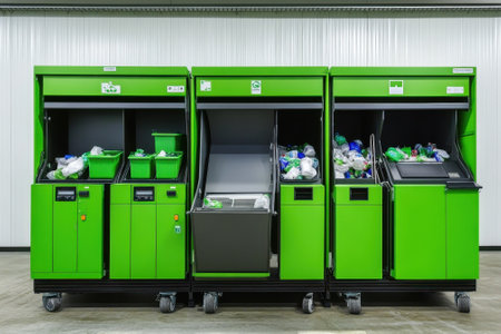 Four green recycling stations filled with sorted plastic materials are arranged in a contemporary setting.