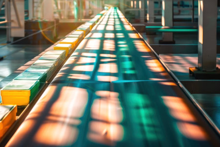 Immerse in the vibrant energy of a modern production line with colorful reflections dancing on conveyor belts and books in motion. A mesmerizing blend of industry and art. Generated A.I.