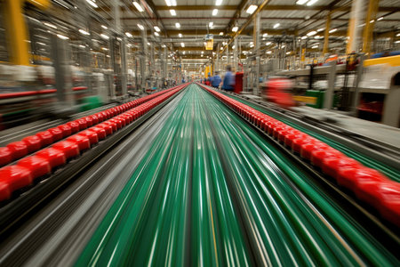 A dynamic view of a manufacturing facility captures the motion of production equipment and a sleek conveyor belt, illustrating industrial efficiency and technology.