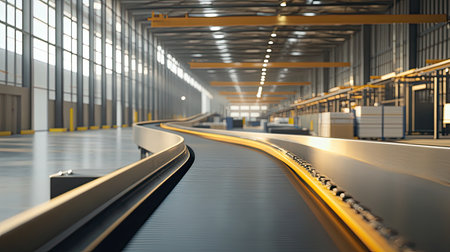 An empty conveyor system in a spacious warehouse features sleek lines and striking lighting, capturing the essence of modern industrial design and efficiency.