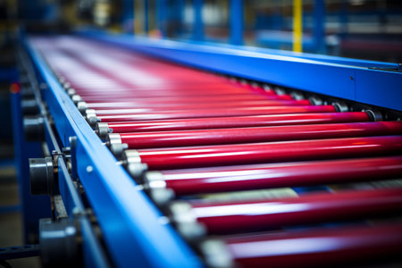 A close-up of a red conveyor belt with rollers in a factory setting. ai generated