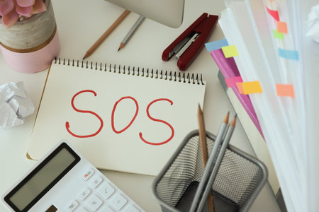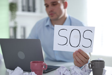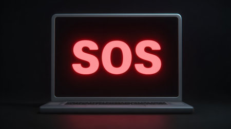 A striking image featuring a laptop displaying a bright red SOS message, symbolizing urgency and the need for immediate attention in crisis situations.