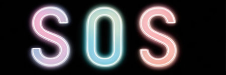 A vibrant neon sign spells out SOS, glowing against a black background, evoking a sense of urgency and alertness in a contemporary design.