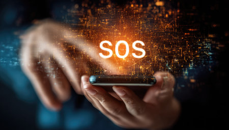 A close-up view depicts hands holding a smartphone displaying the letters SOS, enhanced with a luminous digital particle effect. The image features a shallow depth of field, with soft lighting and a dark background. This visual could be utilized for content related to emergency services, communication, and digital technology.