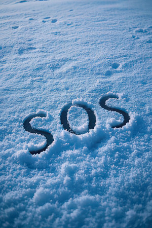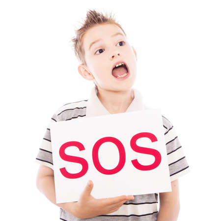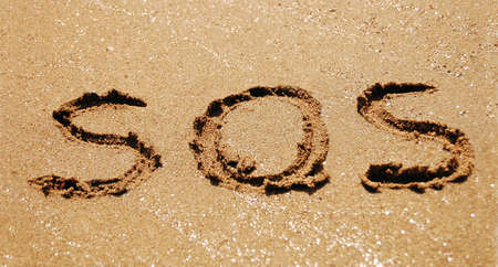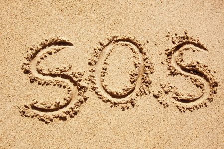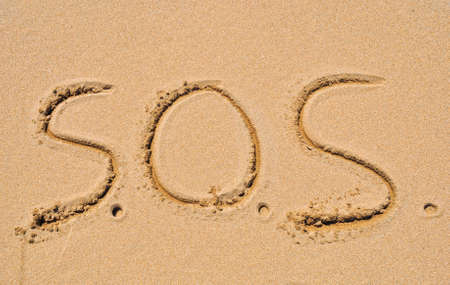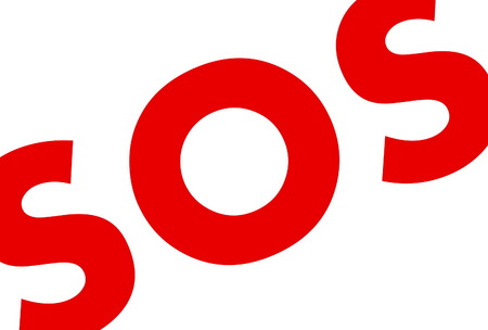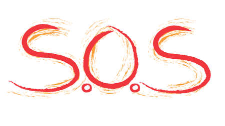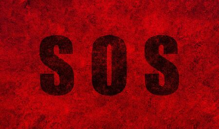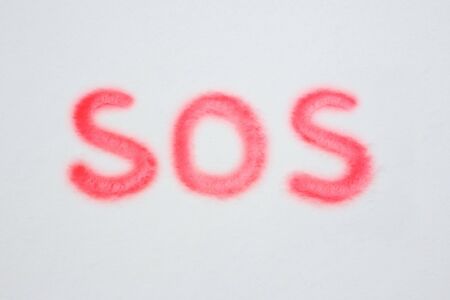 Image of the universal relief word sos painted in red on a white wall. help and assistance concept