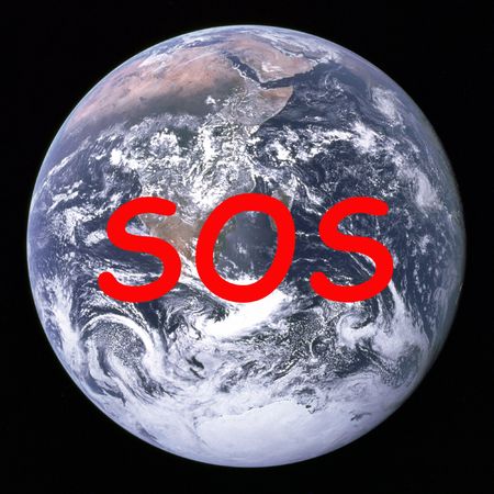 Planet earth with sos message on chalkboard, environmental awareness concept