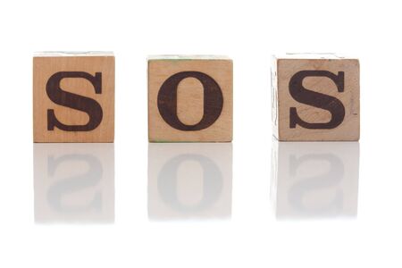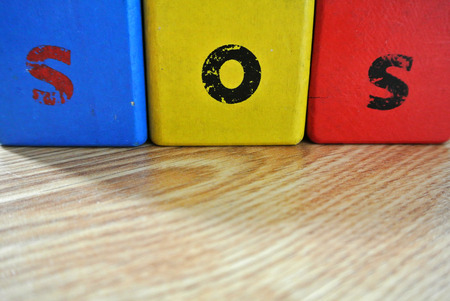 SOS symbol on wooden cubes, toned in dusty rose pink. Save Our Souls call for help concept.