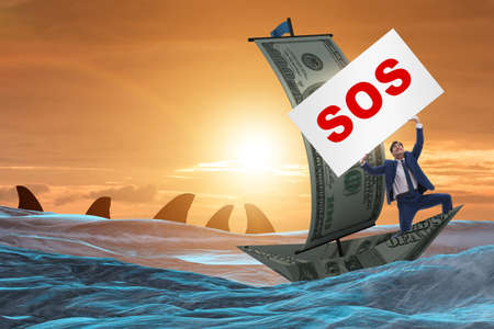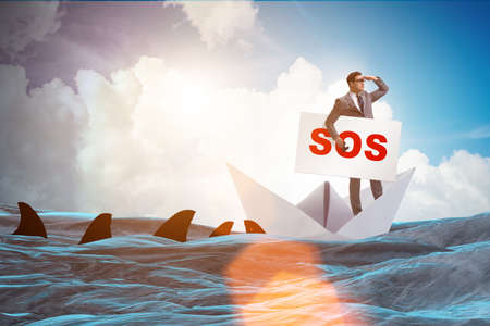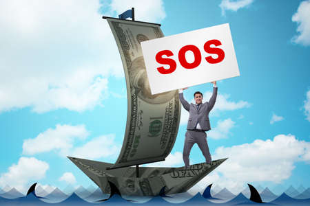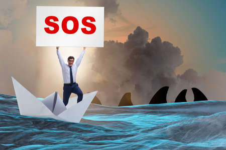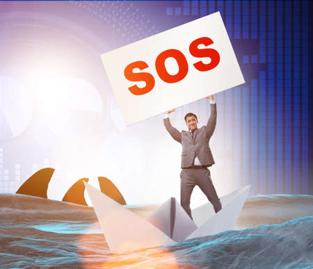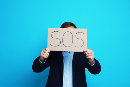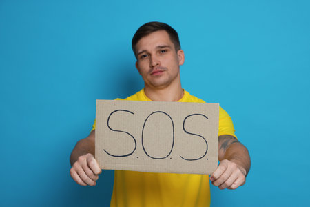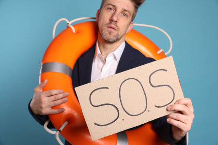 Unhappy businessman with lifebuoy and cardboard sign with word SOS on light blue background