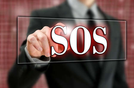 A striking image of a computer screen displaying a bright red 'SOS' signal in a dimly lit environment. This scene conveys a strong sense of urgency and the need for immediate assistance.