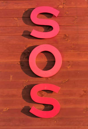 SOS inscription in red letters on a wooden wall, Mind care, nature concept