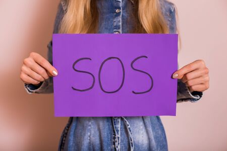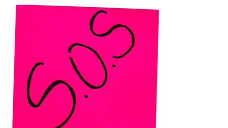 SOS handwriting text close up isolated on pink paper with copy space. Writing text on memo post reminder