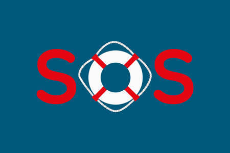 SOS sign with lifebuoy on navy blue background, help center and emergency concept