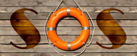 SOS message made from lifebuoy and letters on wooden wall. banner design