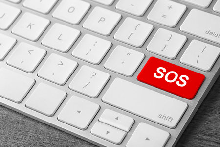 Red button with word SOS on computer keyboard, closeup. Rescue concept
