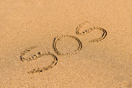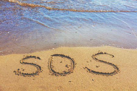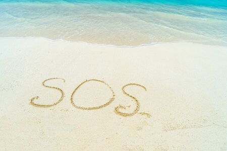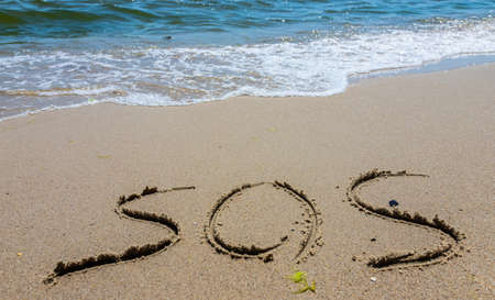 Nice, pleasant and simple sunny summer composition on holidays. Happy relaxing vacations. Text words on wet sand on beach, concept of SOS help
