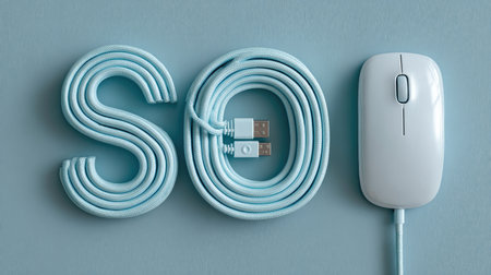 A creative arrangement of light blue cables forming letters alongside a sleek computer mouse, set against a soft blue background. Ideal for tech-related projects.