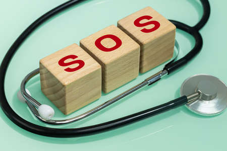 Red SOS inscription on wooden blocks and medical stethoscope, Health concept