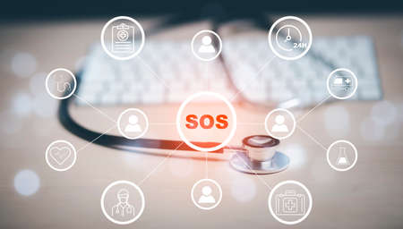Doctor Stethoscope with SOS Emergency app in home, call phone, Chat message icon, Emergency application from smartphone for elderly, technology concept.Old hand touch mobile phone