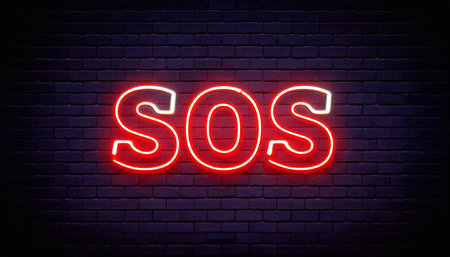 Neon sign emits a bright SOS signal on a dark brick wall, creating a striking visual contrast.